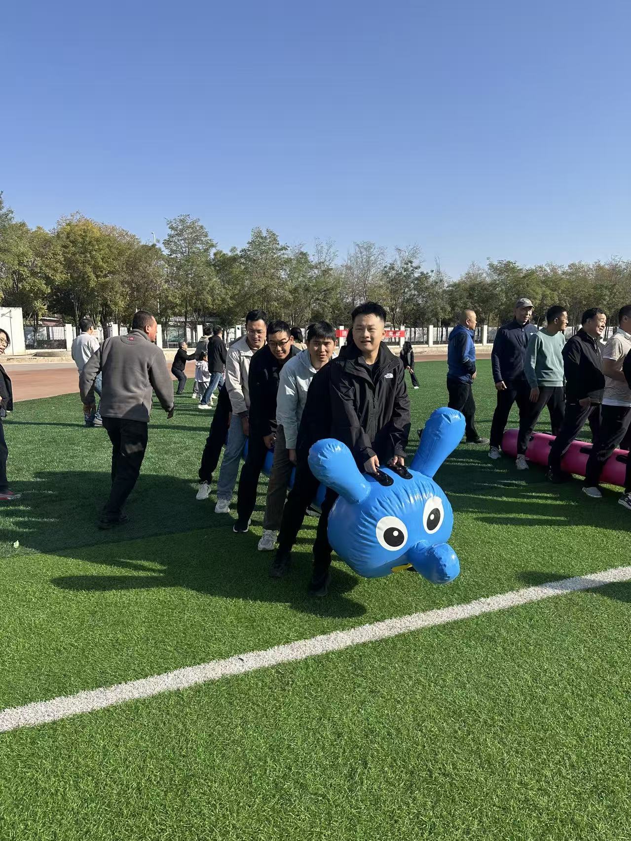 “毛毛虫冲冲冲”环节,参赛老师们跨坐在色彩鲜艳的充气“毛毛虫”上,步伐协调,口号响亮,齐心协力向着终点冲刺。