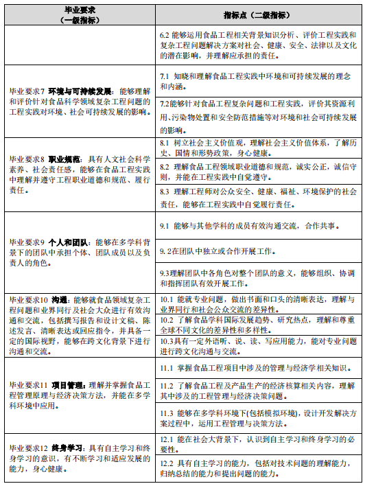 专业立足西部、面向全国,以培养德智体美劳全面发展的社会主义的合格建设者和可靠接班人为己任,秉承“不怕困难,不畏风寒;根深叶茂,本固枝荣”的“沙枣树精神”,培养具有艰苦创业、负重拼搏、勇于创新、开拓进取特质,能够在食品科学与工程领域,尤其是在自治区特色食品资源加工与利用方向从事食品加工生产、品质控制、工程设计、产品研发、经营管理等工作的创新型应用人才。预期员工毕业 5 年左右能达到: