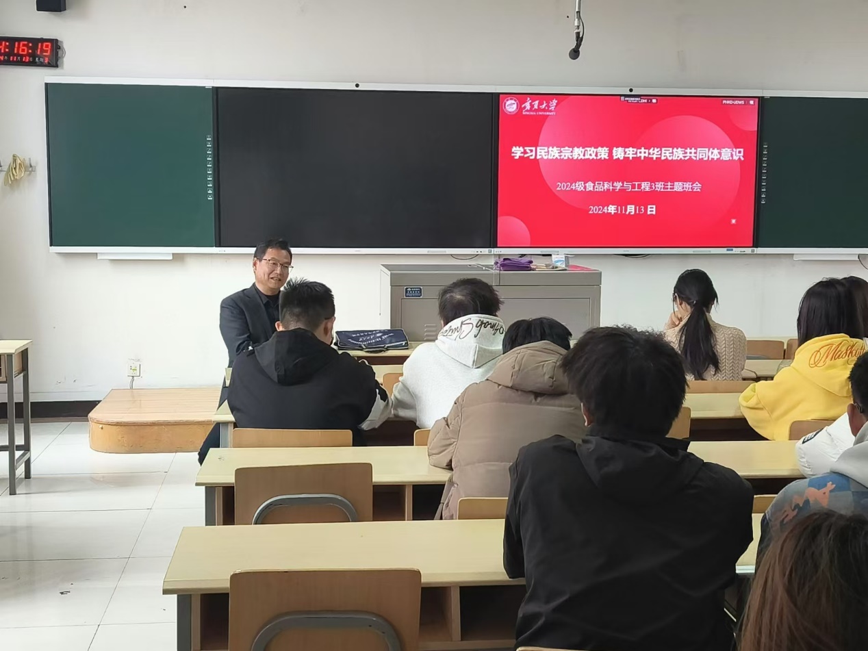 11月13日,开云2024级食品科学与工程专业3班主题班会在文萃二教303教室召开。此次班会主题为“学习民族宗教政策,铸牢中华民族共同体意识”,会议由班主任雒雪丽老师主持,公司联系班级领导李文华副书记出席会议并作了宣讲。