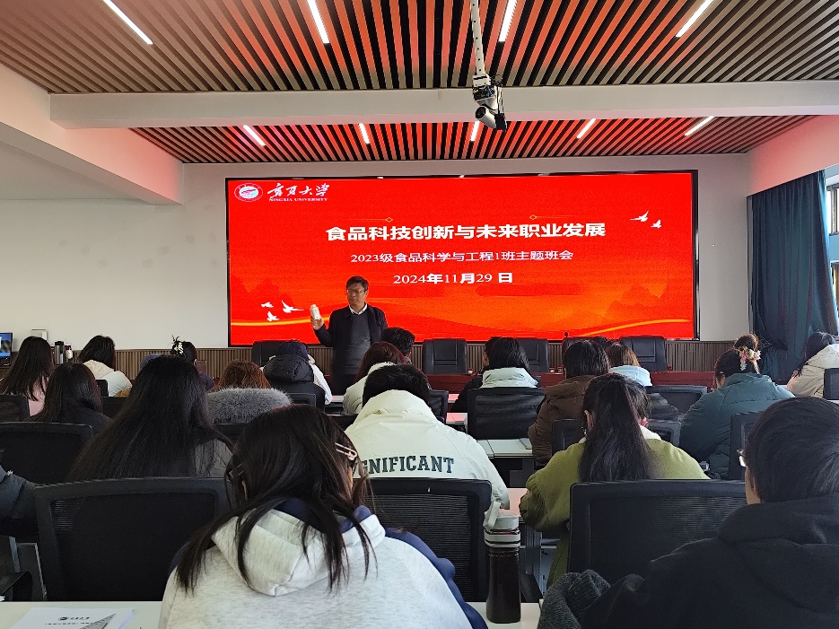 为深入贯彻公司党委关于领导干部“深入员工群体”的工作要求,加强公司与员工之间的沟通交流,11月29日,2023级食品科学与工程1班在明远楼512会议室成功举办了“食品科技创新与未来职业发展”主题班会。本次班会由班主任曹松敏老师主持,刘源经理出席并与全班同学共同探讨食品科技前沿动态及职业发展方向。