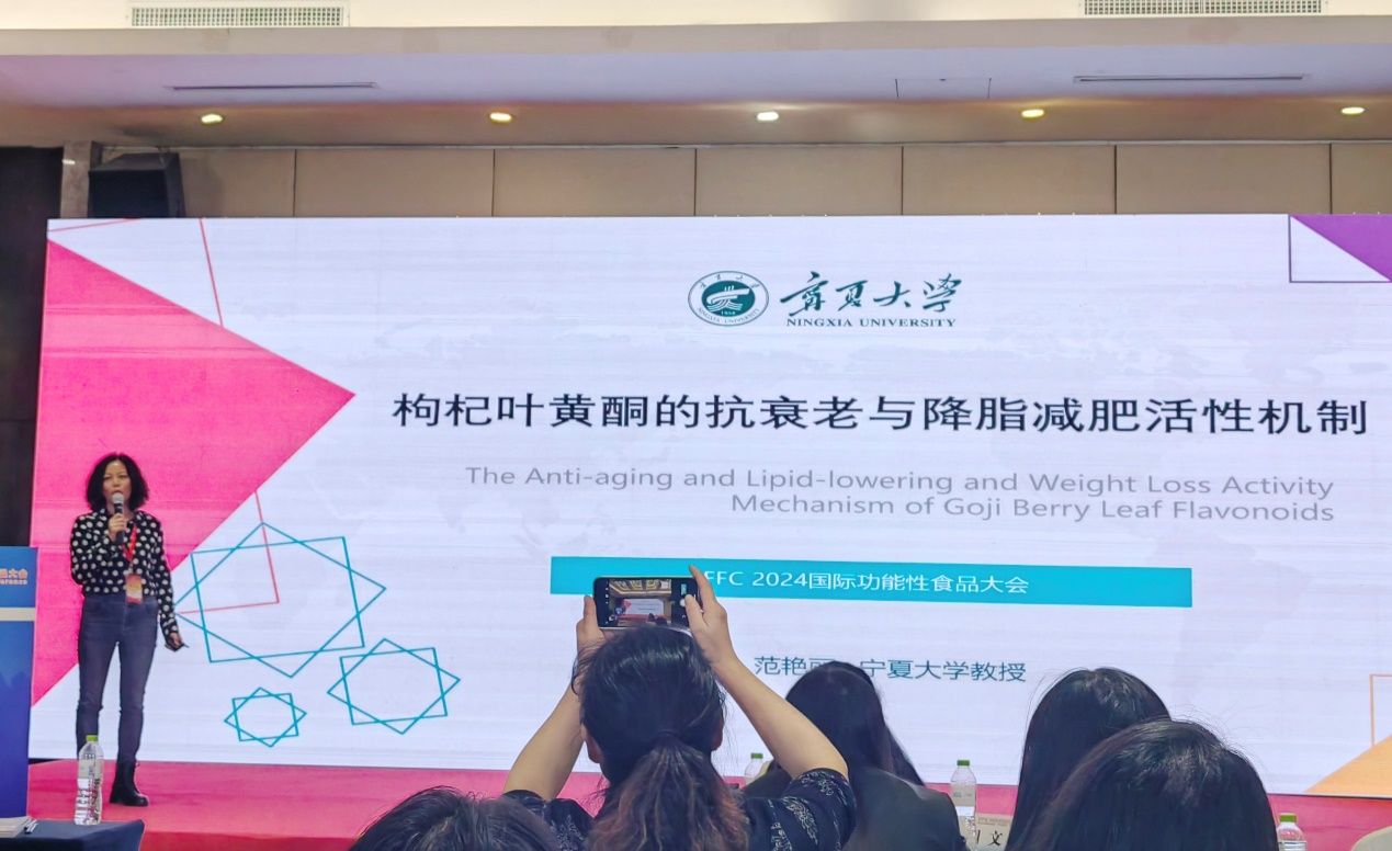 3月30-31日,FFC 2024年国际功能性食品大会在青岛顺利召开。公司食品营养与健康创新团队范艳丽教授在此次会议上作了题为“枸杞叶黄酮的抗衰老与降脂减肥活性机制”的学术报告。