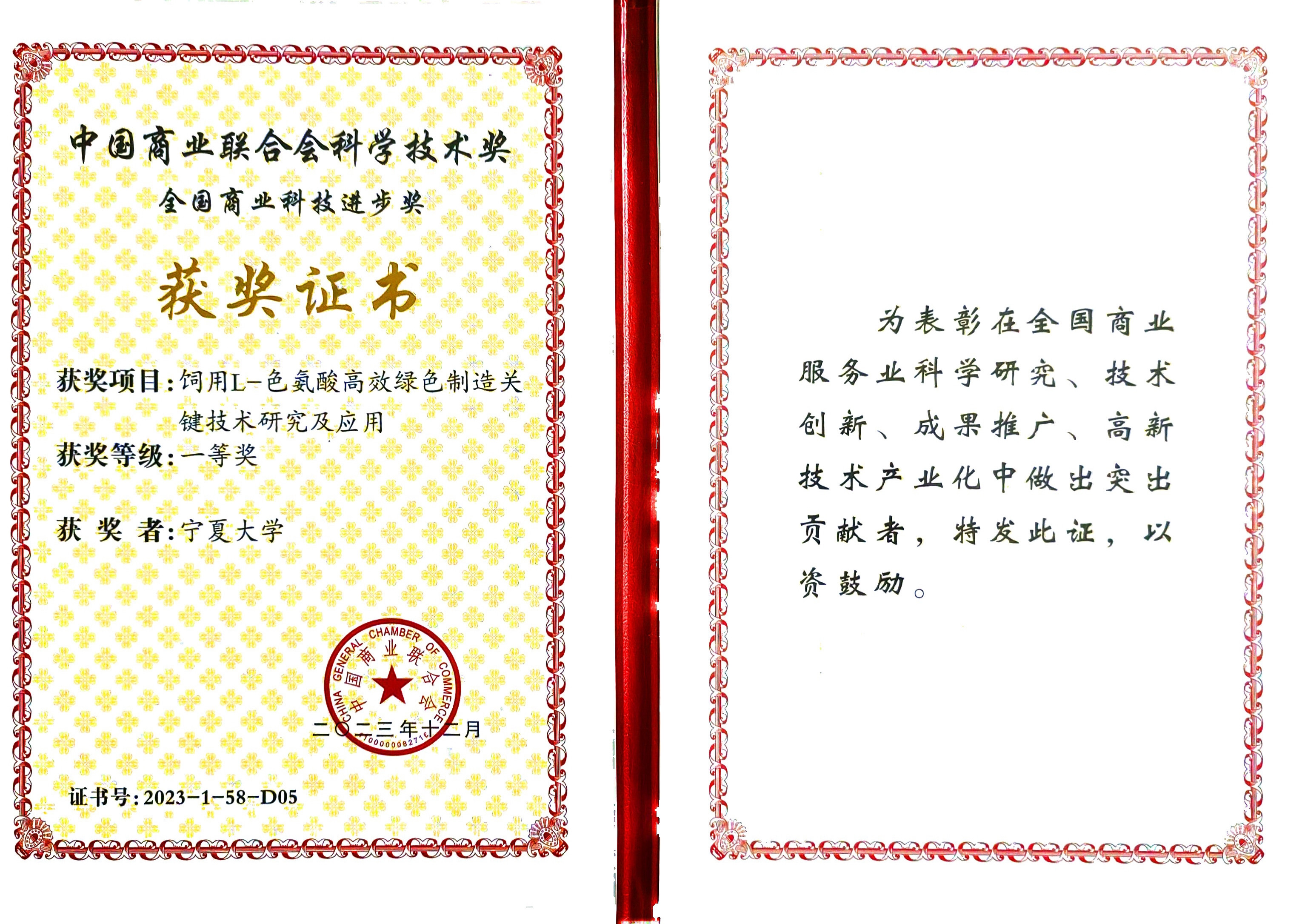 由公司健康食品生物制造研究团队方海田教授、刘慧燕副教授和魏晓博博士参与完成的成果“饲用L-色氨酸高效绿色制造关键技术研究及应用”获得了中国商业联合会2023年度全国商业科技进步奖一等奖。