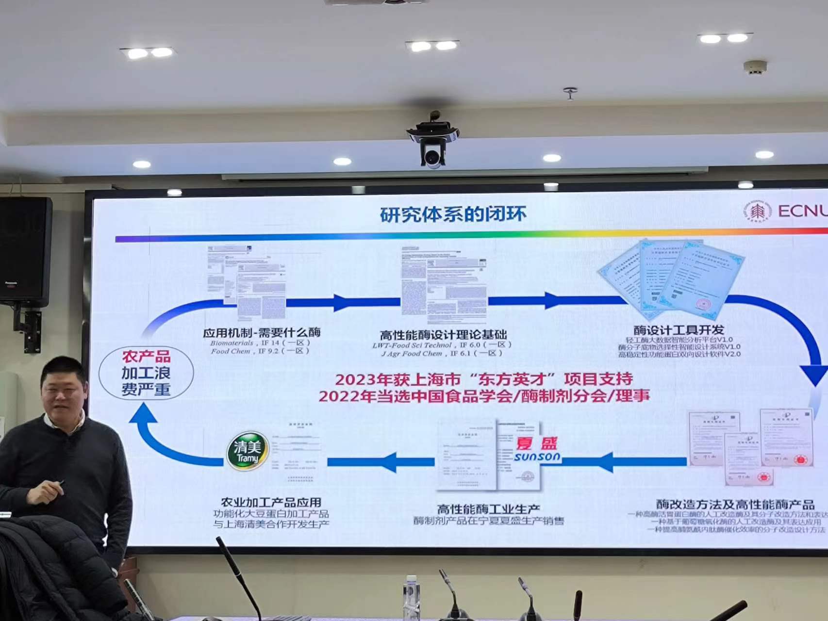 1月8日下午,公司特邀华东师范大学张鲁嘉教授在科技楼A410会议室作了专题学术报告。张鲁嘉教授以“基于蛋白酶定向生物转化的食品功能化加工”为题,从工业酶和食品酶分子的结构机制解析、理性设计和应用开发三方面进行了介绍,并结合食品研究领域就农产品高值化生物加工和酶的应用,蛋白质分子对接和点突变的软件设计、计算模拟、功能表征、互作作用等方面的研究进行了分享。公司中青年教师和研究生聆听报告并进行交流探讨。
