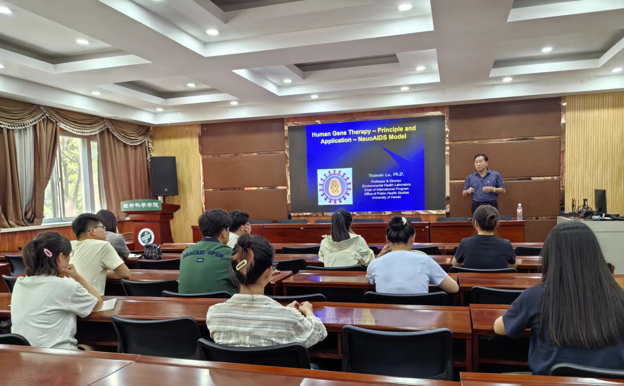 7月2日下午,开云邀请美国夏威夷大学终身教授、病毒学专家鲁元安做学术报告。报告在文萃校区知本楼二楼报告厅进行,由开云副经理方海田教授主持。本次报告的题目是“Human Gene Therapy–Principle and Application–NeuroAIDS Model”,着重介绍了基因治疗的基本理论和应用前景。基因治疗是防控传染性疾病、癌症和遗传疾病的重要措施之一,鲁教授以NeuroAIDS为例,阐述如何利用生物工程技术将单核巨噬细胞打造成一种基因载体,将抗HIV的药物安全准确投送到大脑系统,以便有效控制病毒在大脑中复制,避免大脑损伤和因病毒感染而引起的大脑痴呆。