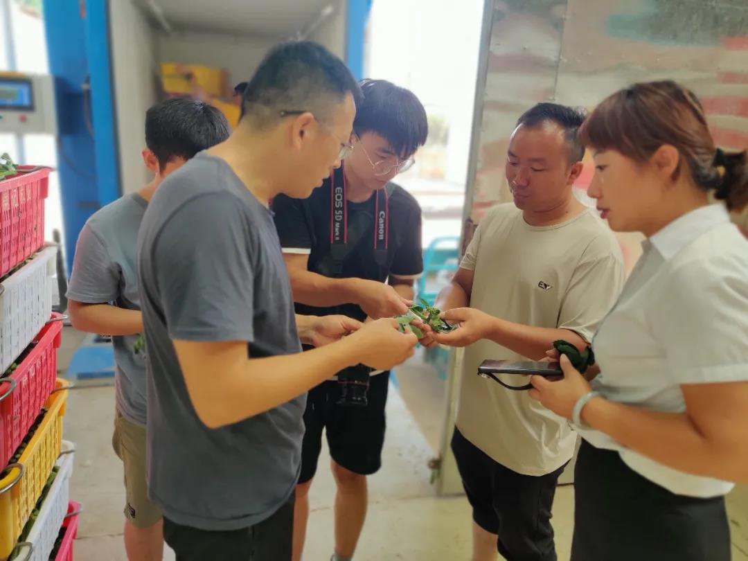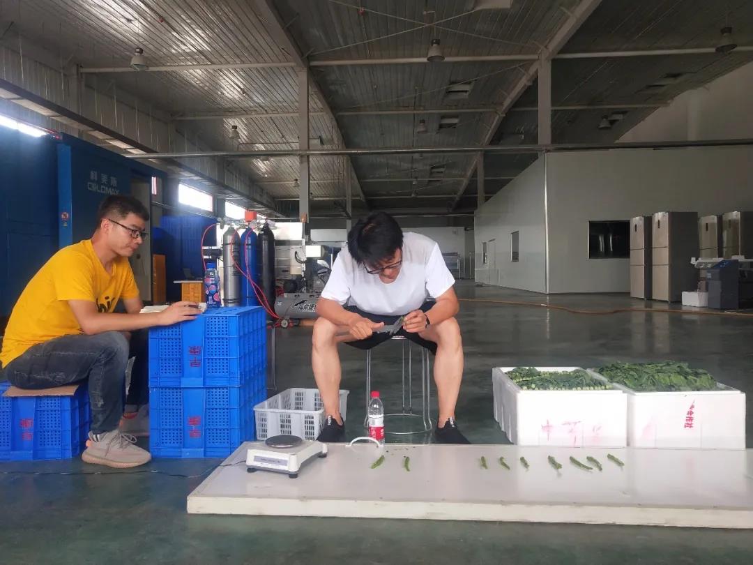 宁夏鑫茂祥冷藏运输有限公司唐佳丽副总及魏小德总管陪同团队,在宁夏鑫茂原菜场参观了菜心、芥蓝的种植及采收现场。魏总讲到,今年在青铜峡菜心、芥蓝种植面积达到1900亩,在河南许昌种植面积达2000余亩,产品供不应求。针对蔬菜采收后预冷存在的问题,本项目研发的真空预冷装备比传统冷库预冷在冷却时间、冷却效率方面有显著的成效,极大的保持了蔬菜的新鲜度,延长了货架期。接着,团队成员就优质蔬菜(菜心、芥蓝)产地移动式真空预冷设备进行了示范应用,预冷时间仅18分钟,就将菜心、芥蓝的温度从27℃降到0℃,产品外观品质得到了很好的保真。