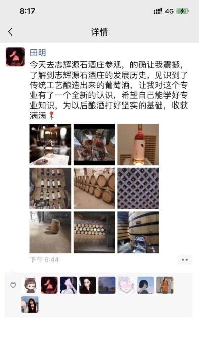 同学们聚精会神地听着讲解员对葡萄酒酿造的整个过程,专心致志的做着笔记,看着橡木桶上的葡萄酒酿造过程的贴画,情不自禁融入葡萄酒的生产中。