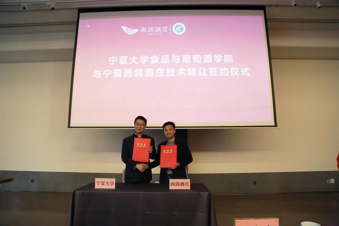宁夏葡萄与葡萄酒研究院副经理张军翔与西鸽酒庄副总经理廖祖宋签订技术转让合同。
