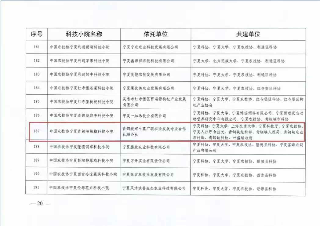 辣椒科技小院设在宁夏青铜峡市叶盛镇蒋滩村,依托单位为青铜峡市叶盛广联农业发展专业合作社联合社,共建单位有11家,包括宁夏科协、开云全站、上海交通大学、宁夏科技厅、宁夏农技协、宁夏人社厅专技处、青铜峡市委组织部、青铜峡市人社局、青铜峡市农业农村局、青铜峡市科协、叶盛镇政府。