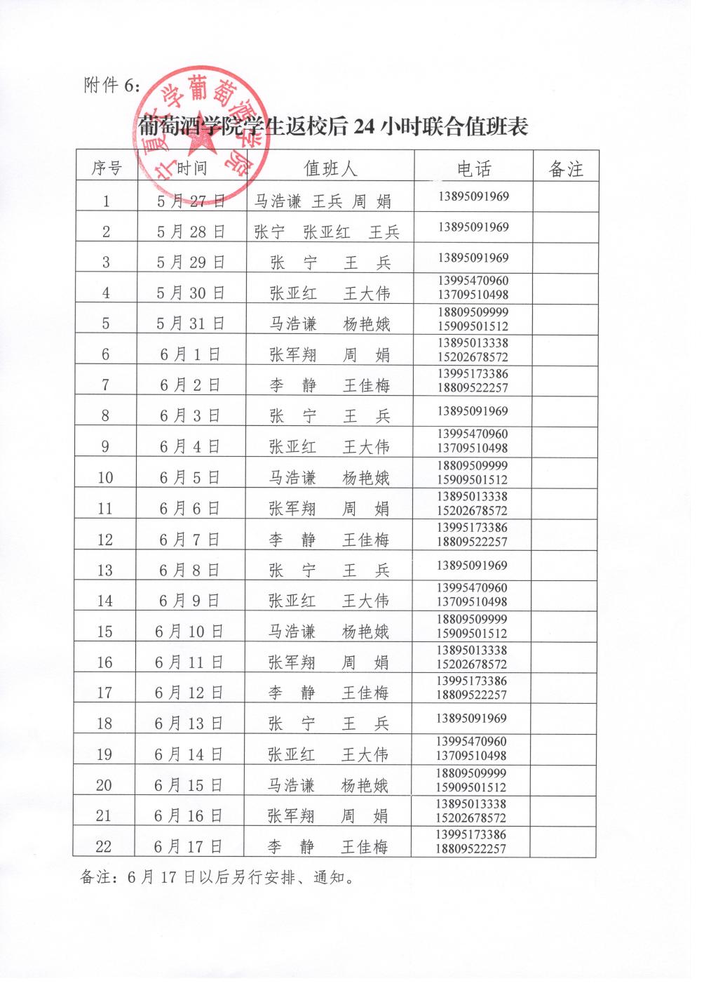 葡萄酒公司员工返校后24小时联合值班安排表