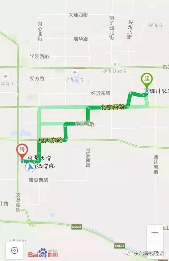 银川火车站→惠北巷→兴洲北街→北京西路→金波南街→经天东路→同心南街→开元东路→开云全站葡萄酒公司