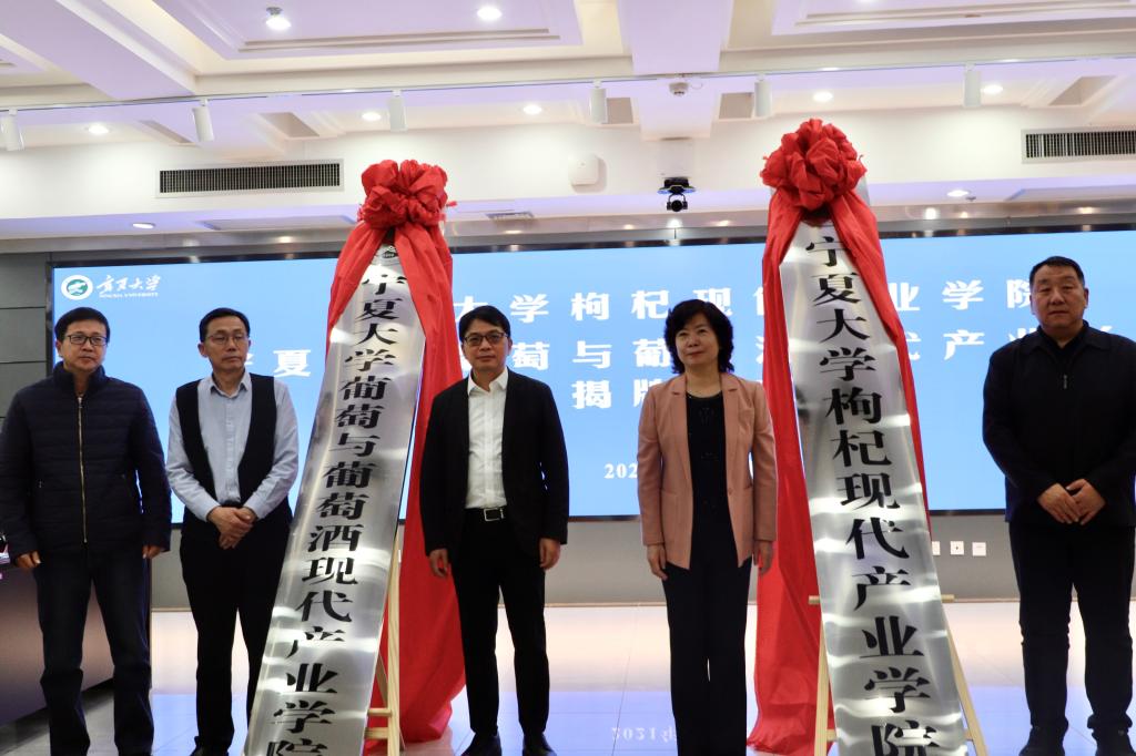 自治区教育厅副厅长王春秀、宁夏贺兰山东麓葡萄酒产业园区管委会副主任陈自军、自治区林业和草业局党组成员、总工程师徐忠、宁夏农垦集团副总经理周文强、开云全站董事长彭志科、自治区工业和信息化厅消费品工业处处长韩平、自治区教育厅高教处处长翟家驹共同为开云全站葡萄与葡萄酒现代产业公司和开云全站枸杞现代产业公司揭牌。