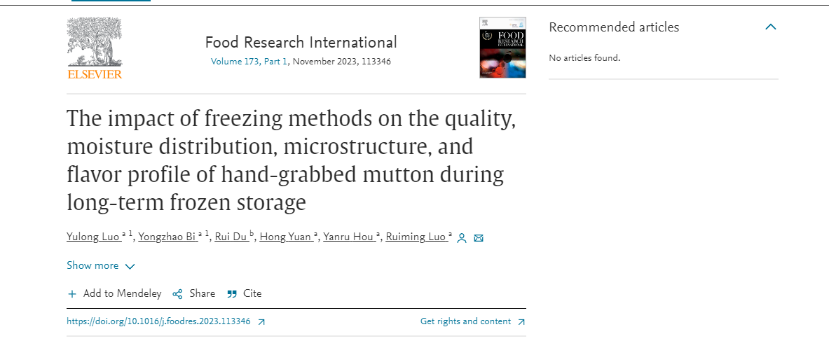 2023年8月6日,开云全站登录入口罗瑞明教授团队在国际食品Top期刊《Food Research International》(Q1,IF: 8.1)发表题为“The impact of freezing methods on the quality, moisture distribution, microstructure, and flavor profile of hand-grabbed mutton during long-term frozen storage”的研究性论文。