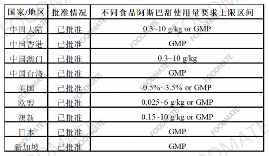 表1主流国家/地区阿斯巴甜在不同食品中使用量要求上限区间